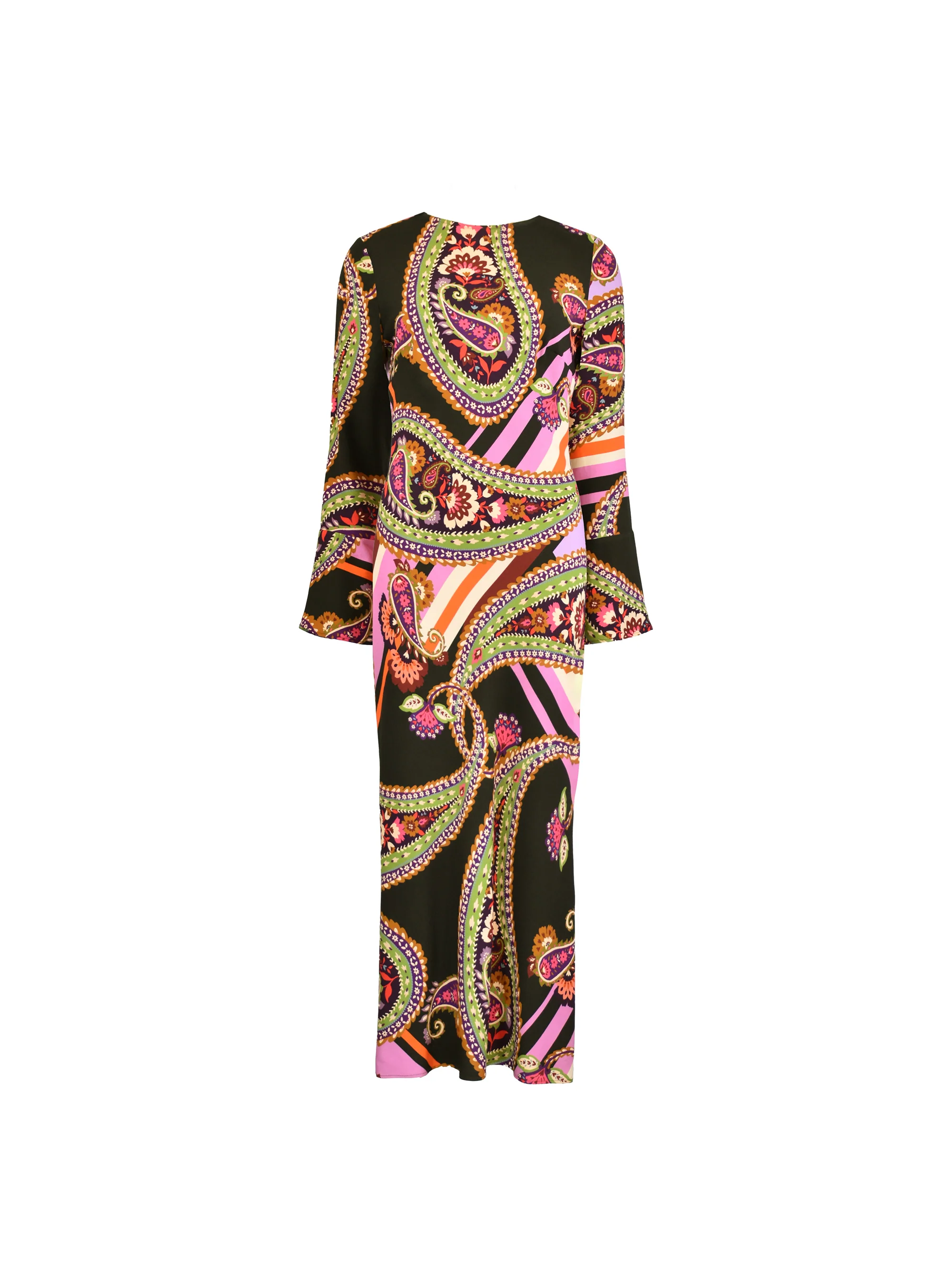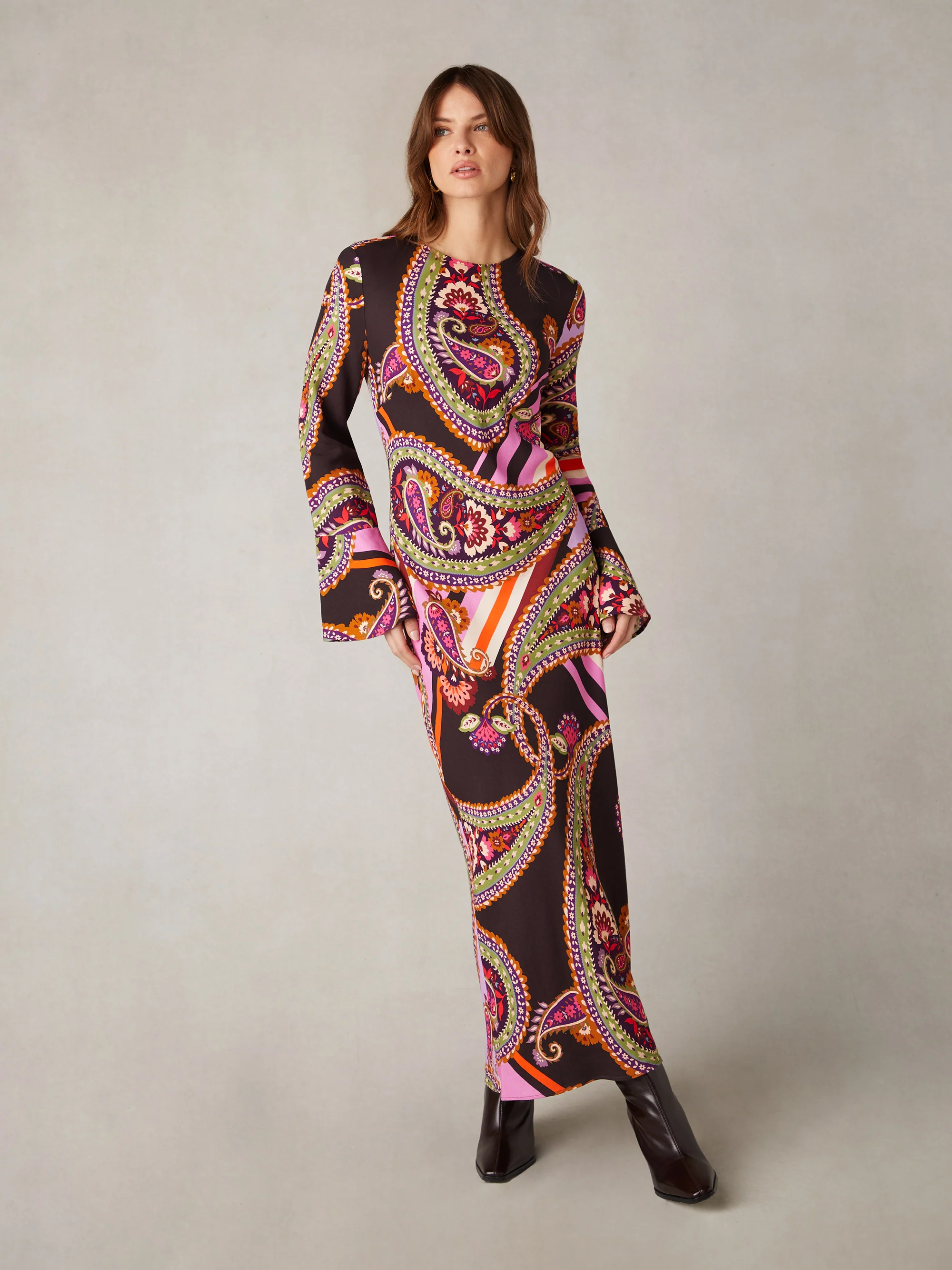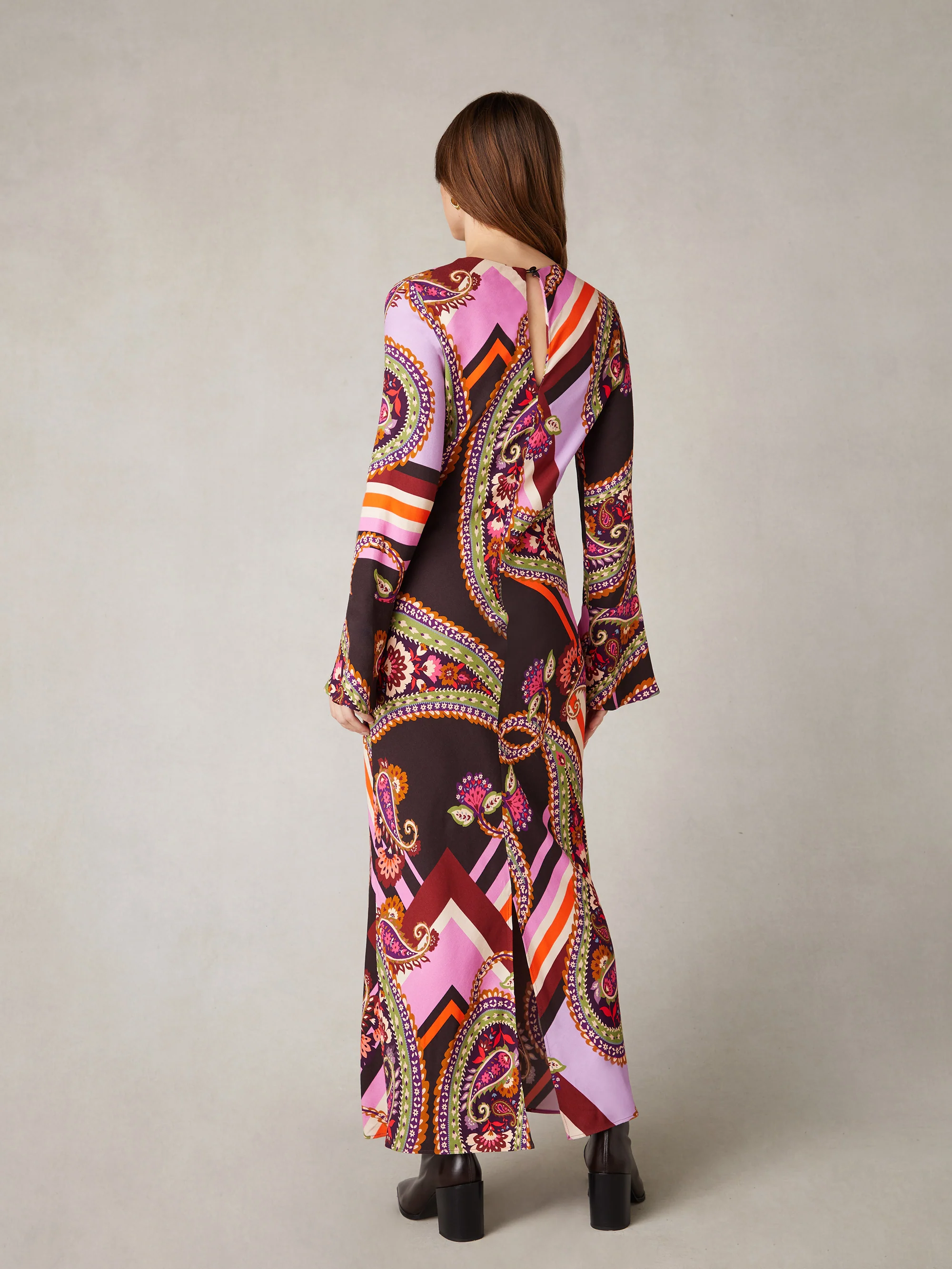 Multi Paisley Print Flute Sleeve Maxi Dress