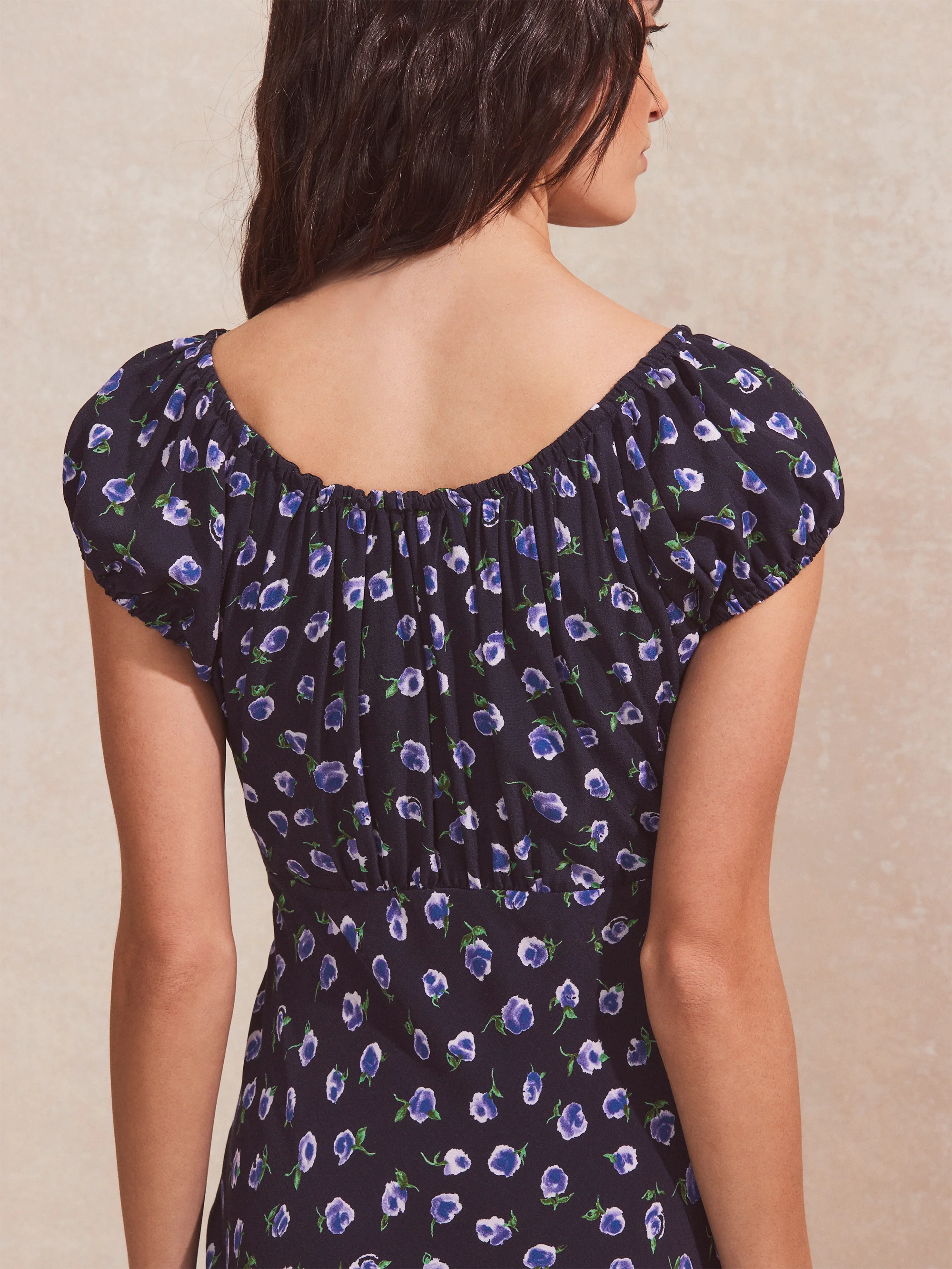 Navy Floral-Print Gathered-Neck Midi Dress
