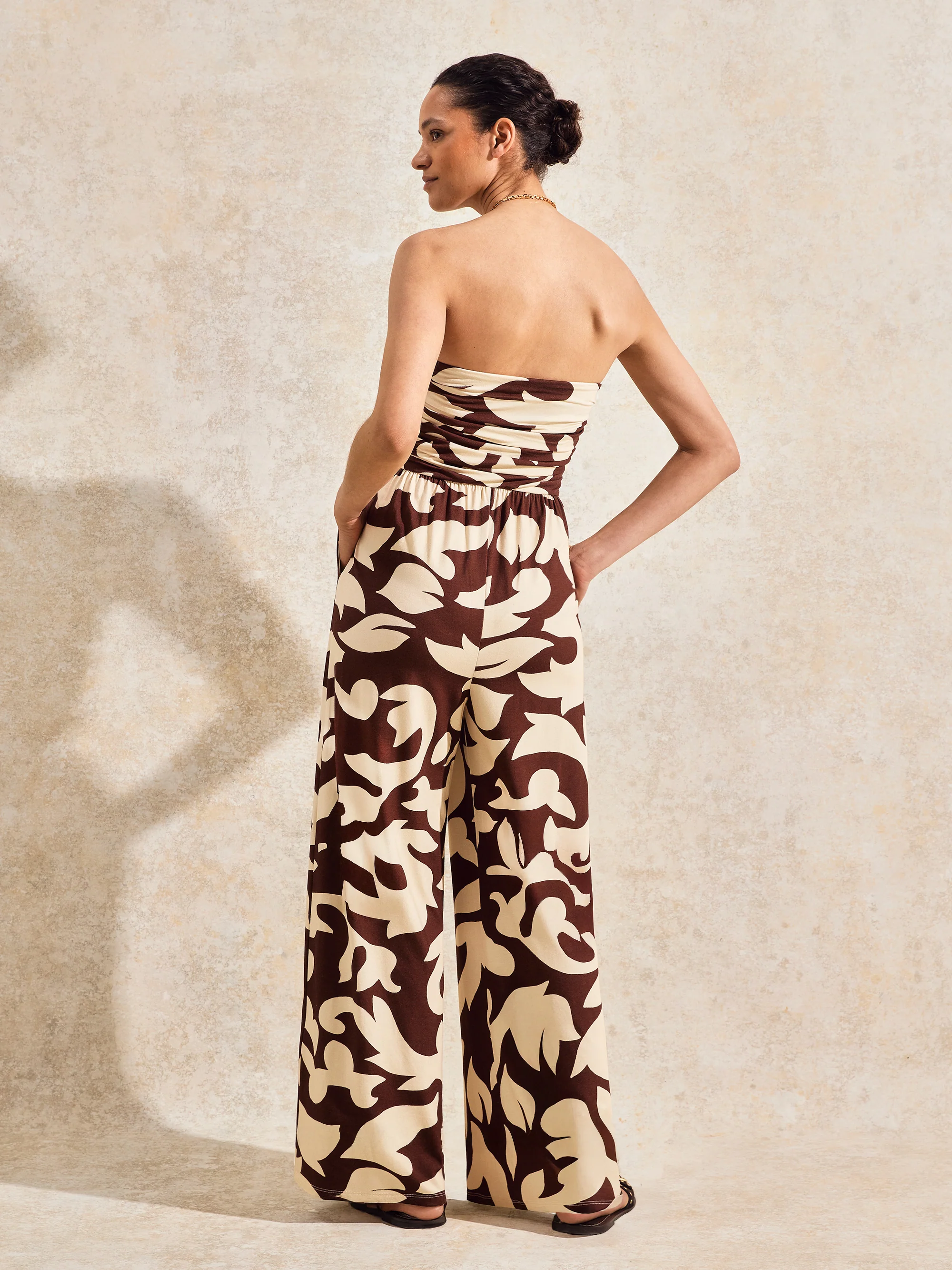 Brown And Cream Abstract-Print Bandeau Jumpsuit