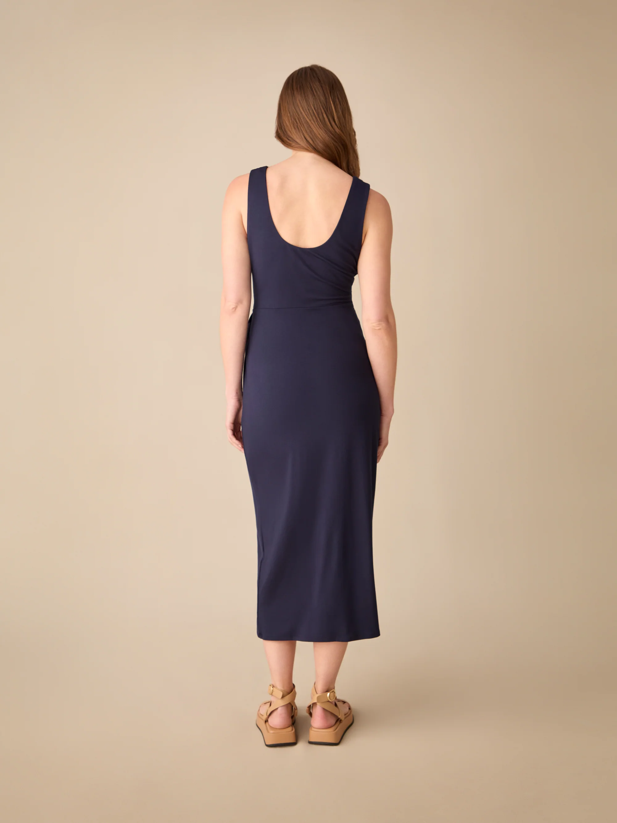 Petite Navy Floral-Print Gathered-Neck Midi Dress
