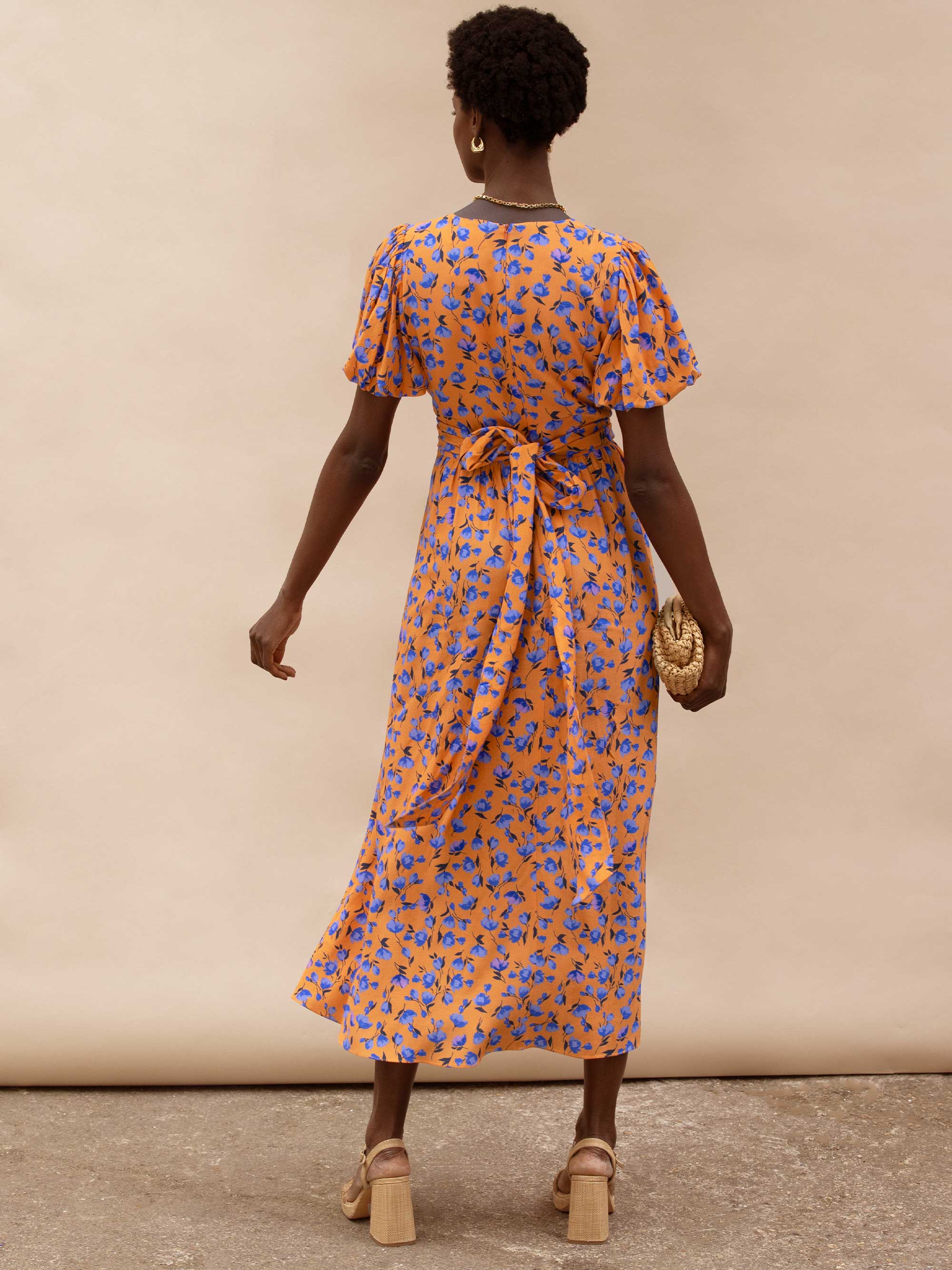 Orange And Blue Floral Puff Sleeve Dress